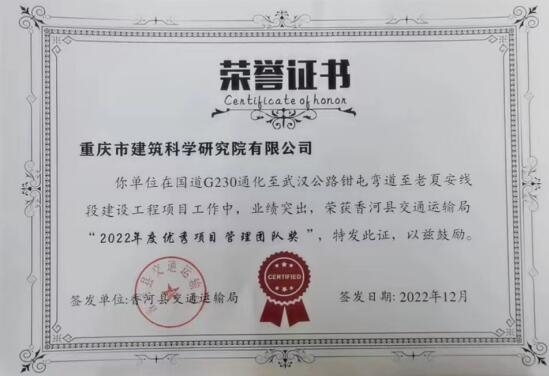 國道G230通武線項目,投資總估算約為13.36億元,全長5.3公里,全線采用雙向六車道一級公路標準建設(shè),設(shè)計速度80公里/小時,全線設(shè)特大橋1座。2022年6月20日正式開工建設(shè)以來,市建科院始終堅持高效統(tǒng)籌、科學(xué)調(diào)度,在保證質(zhì)量和安全的前提下,督促項目監(jiān)理部切實發(fā)揮監(jiān)理職能,要求總承包項目部優(yōu)化施工組織,協(xié)助政府相關(guān)部門強化拆遷調(diào)度,為項目質(zhì)量、安全和投資年度目標的實現(xiàn)打下夯實的基礎(chǔ),截止目前已完成投資約5.05億元,實現(xiàn)安全生產(chǎn)“零”事故,并獲得主管部門頒發(fā)的2022年度“優(yōu)秀項目管理團隊獎”。