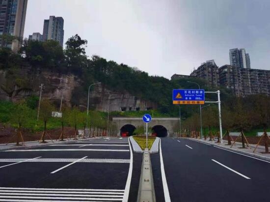 重慶市重鋼片區百花村隧道道路工程位于重慶市重鋼片區,是重慶市重難點建設項目,設計道路左線全長1104.628米,其中隧道長660.525米;右線全長898.092米,其中隧道長552米。設計終點段標準路幅寬度為36.5米,隧道標準路幅寬度為9米,道路等級為城市次干路,雙向四車道,設計車速為40km/h,含隧道1座(按左、右線實施)。項目通車后,實現了大渡口重鋼片區東西貫通,進一步加強了九宮廟商圈與濱江片區的聯系,激活了豐富的濱江岸線資源,對加快重鋼片區的產業轉型步伐、提升片區土地利用價值、促進大渡口區社會經濟發展具有重要意義。