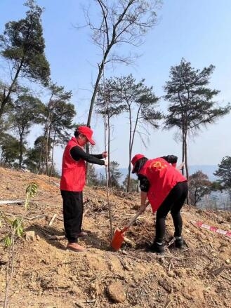此次植樹點位于縉云山歇馬街道“8.21”山火發生地,2022年,重慶歷經“8.21”山火考驗,需通過人工造林對受災區域進行修復。半年后,春風又綠縉云山,伴隨驕陽,第一黨支部全體黨員同志們身穿紅馬甲,頭戴“小紅帽”,到達植樹點后揮鍬挖土、扶正樹苗、填土夯苗、堆砌圍堰、澆水灌溉......接連種下一棵棵木荷樹、楓香樹。現場一片繁忙景象,其樂融融、氣氛熱烈。