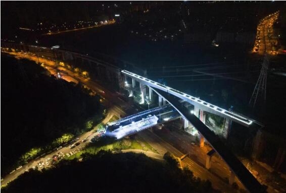 為最大程度減少對(duì)運(yùn)營(yíng)線路的影響,縮短建設(shè)工期,保障施工安全,項(xiàng)目部決定采用橋梁轉(zhuǎn)體工藝進(jìn)行施工,即在6號(hào)線兩側(cè)將T構(gòu)連續(xù)梁澆筑完成,以橋墩為軸逆時(shí)針轉(zhuǎn)體,跨越既有6號(hào)線進(jìn)行對(duì)接。7月28日1時(shí)56分,6號(hào)線東延工程劉家坪站至百樂(lè)園站高架區(qū)間的兩座T構(gòu)連續(xù)梁轉(zhuǎn)體橋開(kāi)始轉(zhuǎn)體施工,經(jīng)過(guò)52分鐘的轉(zhuǎn)體作業(yè)后,實(shí)現(xiàn)精準(zhǔn)對(duì)接,這既是6號(hào)線東延工程高架區(qū)間首座連續(xù)梁轉(zhuǎn)體,也是重慶軌道交通領(lǐng)域首次實(shí)現(xiàn)連續(xù)梁跨越既有軌道交通線路轉(zhuǎn)體,為后續(xù)類似施工提供了范本。