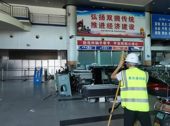 由于時間緊、任務重,為保證萬州五橋機場T1航站樓改造升級后續工作順利推進,市建科院公司接到委托后立即組織了在檢測、鑒定領域具有豐富經驗的專家及檢測人員進駐現場進行檢測。檢測人員嚴格按照相關規范的要求,充分考慮現場檢測的客觀條件,編制了詳盡的檢測方案,于2023年8月29日開始現場檢測。在所有檢測人員的共同努力下,于8月31日如期完成了現場檢測工作,形成的檢測、鑒定報告為后續改造設計提供了依據。