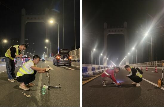 鵝公巖長江大橋是重慶主城區橫跨長江連接九龍坡區和南岸區的重要特大橋梁,是快速抵達成渝高速和渝黔高速的主要通道,大橋為雙向八車道,于2000年12月建成通車。近年來,隨著車流量急速增長及重車通行,橋面瀝青鋪裝層產生較多病害,可能影響使用壽命。為全面掌握橋面鋪裝層病害狀況,檢測中心選派豐富經驗的檢測人員提前收集項目資料,協商交通組織方案并編制檢測方案,保證任務順利開展。全體檢測人員高度重視夜間工作的安全問題,布設大量交通導行標牌、施工限速標志等交通設施,全員穿反光背心、佩戴安全警示燈進行病害分布、平整度、摩擦系數、構造深度等指標的檢測,確保數據的真實性和準確性。最終檢測數據和狀況評估以報告編制工作會的形式發布,為鋪裝層病害專項整治專項設計提供了技術依據,為后續的橋面鋪裝層病害整治方案制定提供了科學支撐。