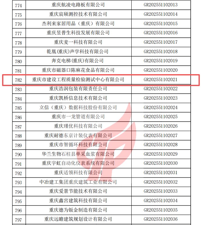 近日,全國高新技術(shù)企業(yè)認定管理工作領(lǐng)導小組辦公室正式發(fā)布《對重慶市認定機構(gòu)2025年認定報備的第二批高新技術(shù)企業(yè)進行備案的公告》,重慶設計集團市建科院所屬子企業(yè)重慶市建設工程質(zhì)量檢驗測試中心有限公司,獲評“國家高新技術(shù)企業(yè)”。